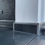 Die Sockelfliesen wurden aus der Bodenfliese geschnitten und bekamen eine Abschlussschiene von Schlüter Systems in Quadec Aluminium gebürstet Optik.