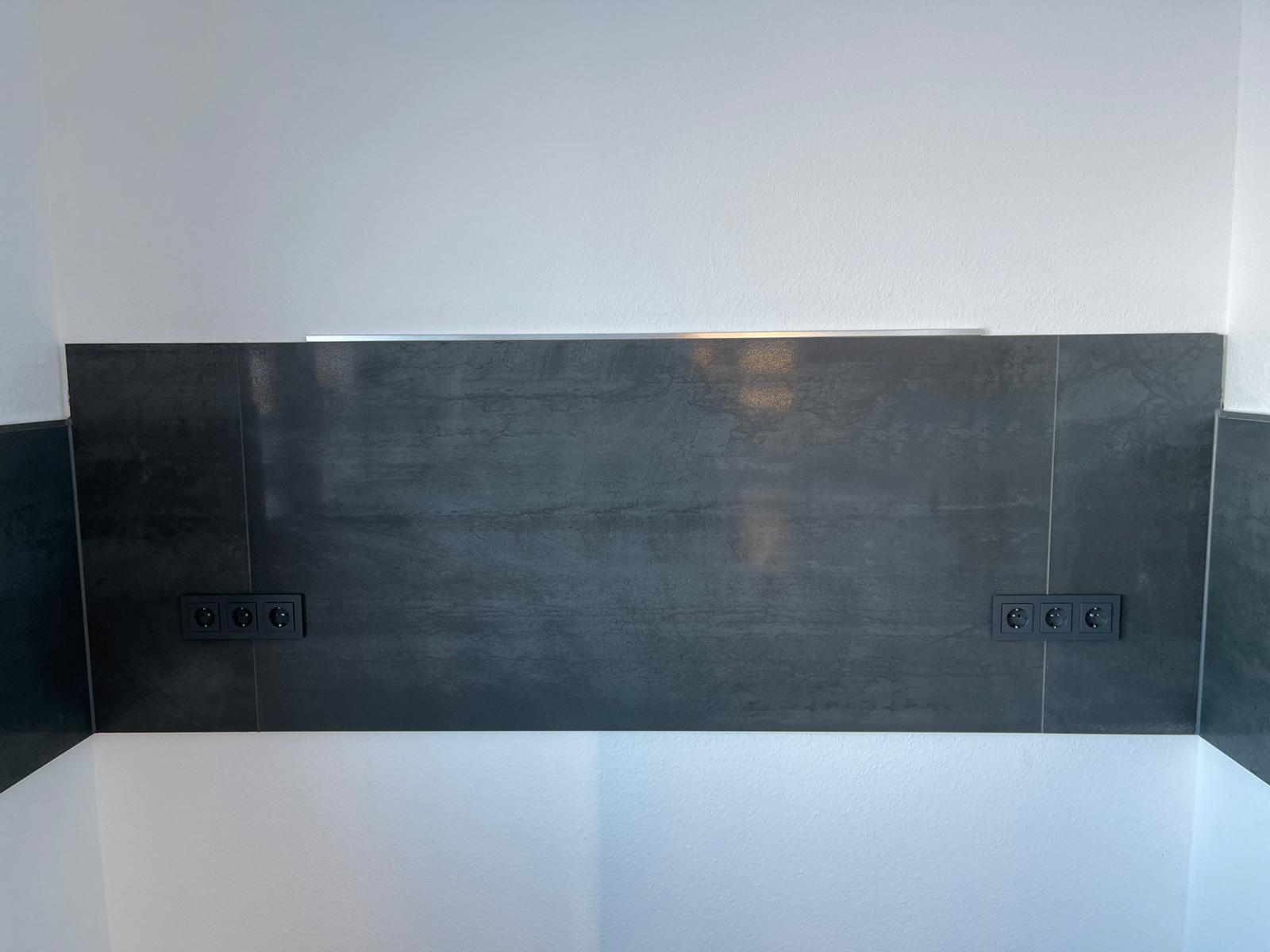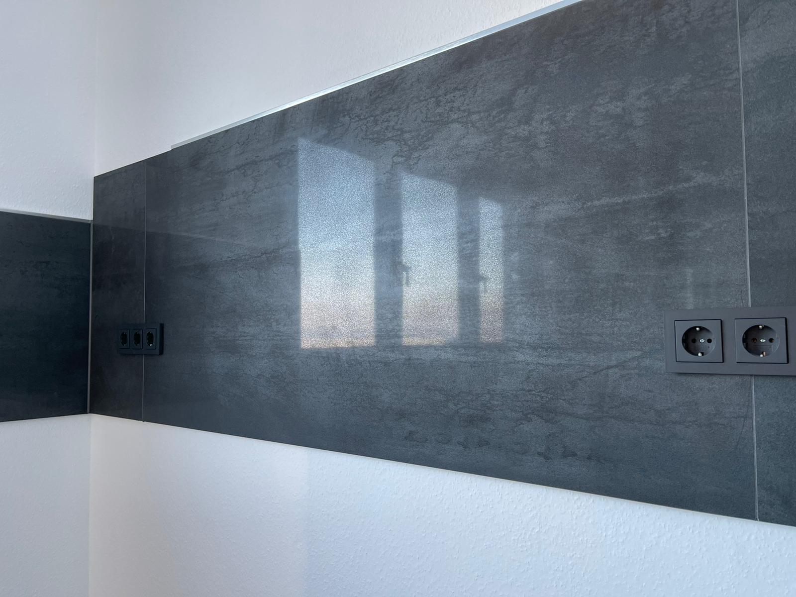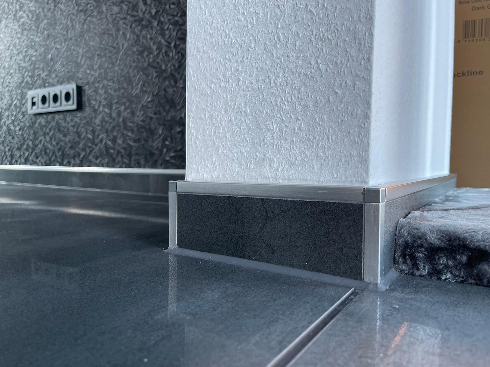 Die Sockelfliesen wurden aus der Bodenfliese geschnitten und bekamen eine Abschlussschiene von Schlüter Systems in Quadec Aluminium gebürstet Optik.