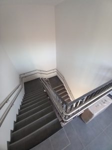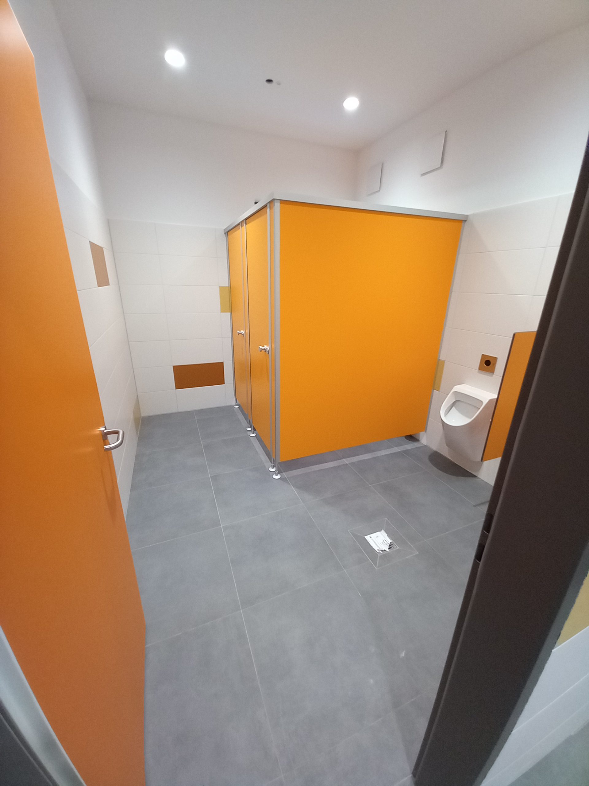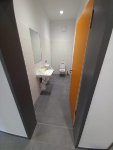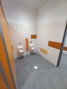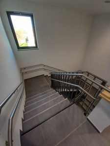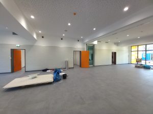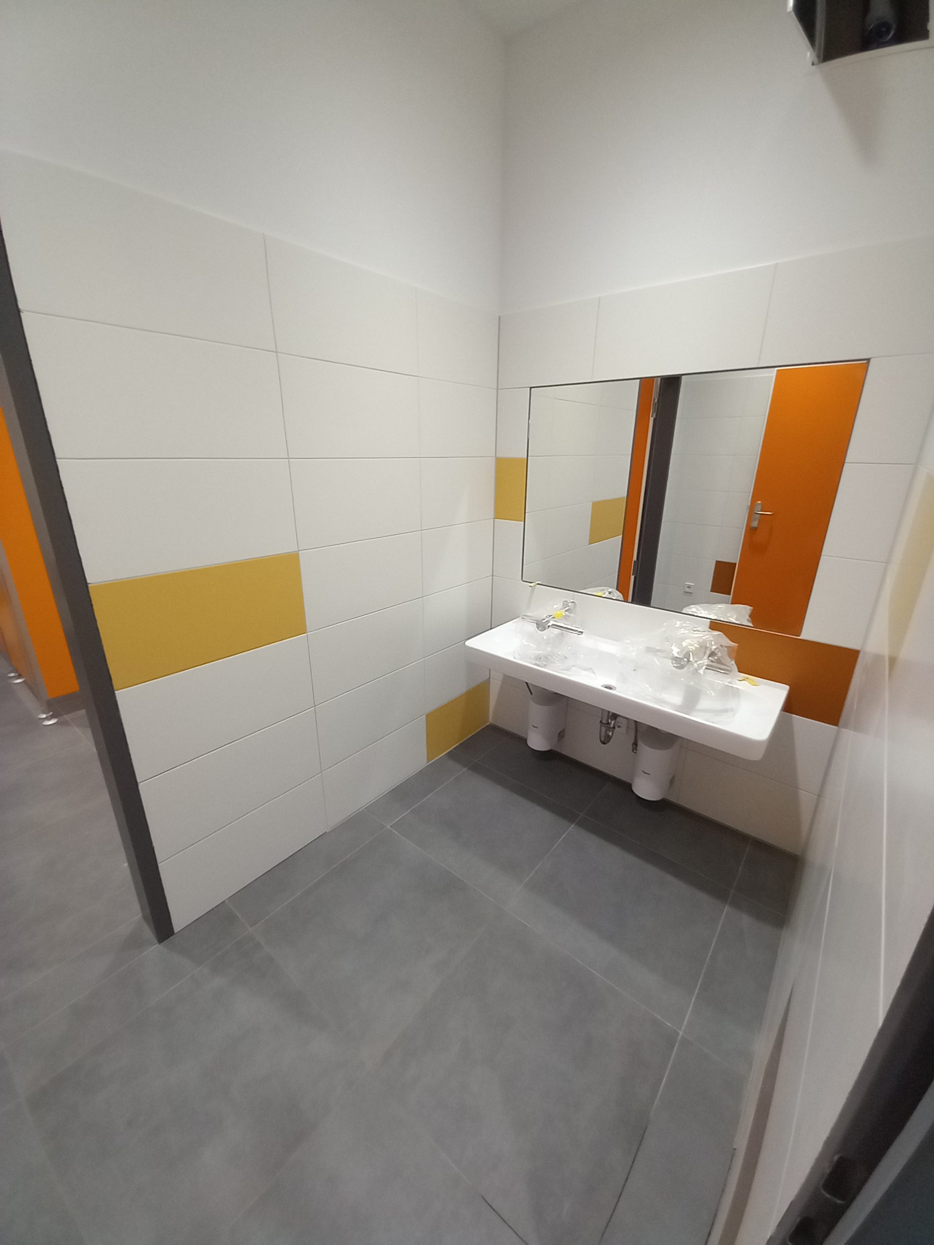 verlegt wurden Wandfliesen von ABK Plural neutral, ocker und gelb in 30/60, sowie Bodenfliesen Mirage Glocal Classic 60/60 cm im Eingangsbereich, Treppenhaus, Speisesaal/ Aula und in den WC-Anlagen. Bauchemielieferant Sopro